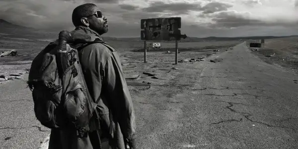 Denzelis Vašingtonas žvelgia į tolį į „Eli knygos“ reklamos įvaizdį.