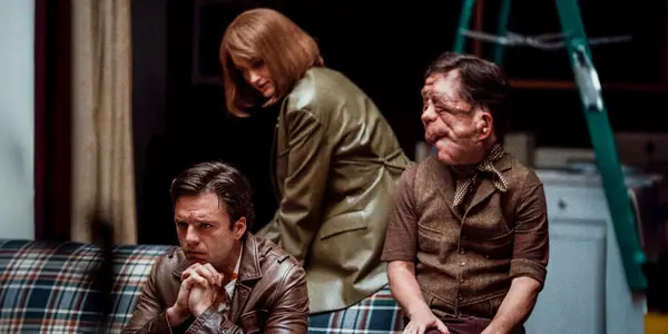 Edvardas (Sebastian Stan) looking at his new reflection in the mirror in Kitoks vyras