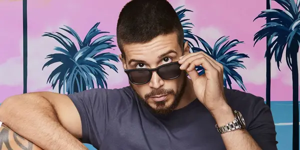 Vinny Guadagnino ant Džersio kranto, žiūrint į savo akinių nuo saulės kraštą