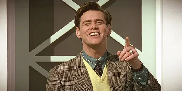 Jimas Carrey rodydamas pirštą į Trumano šou